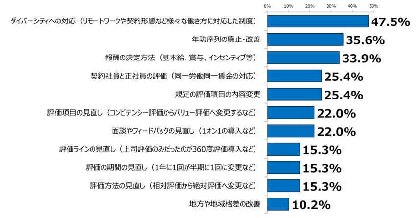 1年以内で人事評価の見直しを行ったと回答した人にその見直し内容を聞きました。その結果、リモートワークや契約形態など様々な働き方に対応するための「ダイバーシティへの対応」が最も多く47.5%。以下「年功序列の廃止・改善」35.6%、「報酬の決定方法」33.9%、「契約社員と正社員の評価」25.4%、「規定の評価項目の内容変更」25.4%と続きます。人事評価制度を社会や労働環境・意識の変化に対応して見直す必要性が経営・人事には求められているようです
