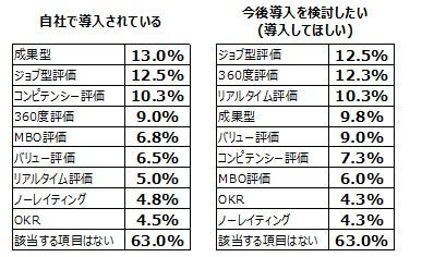 今回の全対象者(経営者/人事担当者/一般社員)に自社で導入されている制度、導入を検討したい(してほしい)制度についてそれぞれ聞いてみました。【導入されている制度】では、1位「成果型」13.0%、2位「ジョブ型評価」12.5%、3位「コンピテンシー評価」10.3%。【今後導入を検討したい制度】では、1位「ジョブ型評価」で12.5%、2位「360度評価」12.3%、3位「リアルタイム評価」10.3%という結果に。ジョブ型評価といった専門性への評価や、360度評価といった周囲への貢献評価、リアルタイム評価といった現場での成長評価などが今後のトレンドとなっていくのかもしれません。