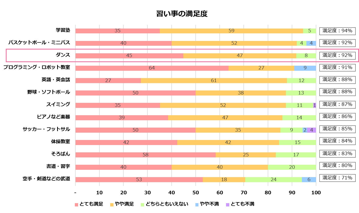 「ダンス」の満足度は「バスケットボール」と並び92%で、「学習塾」の次に高い。