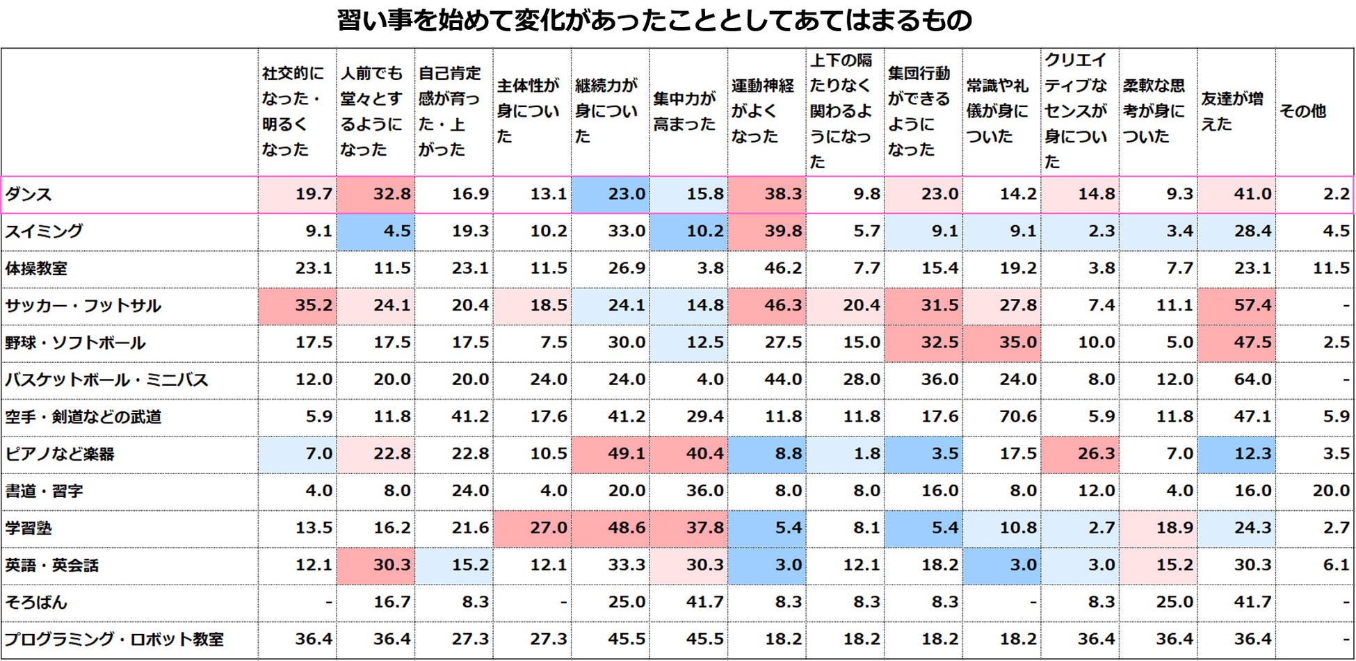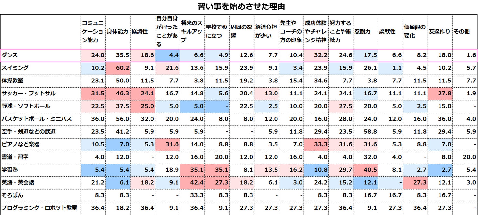 文化・学習系が「将来のスキルアップ」「学校で役に立つ」。ダンスは、「新しい挑戦による成功体験」、「コミュニケーション力・協調性の向上」 など、クリエイティヴな領域のポイントが高い