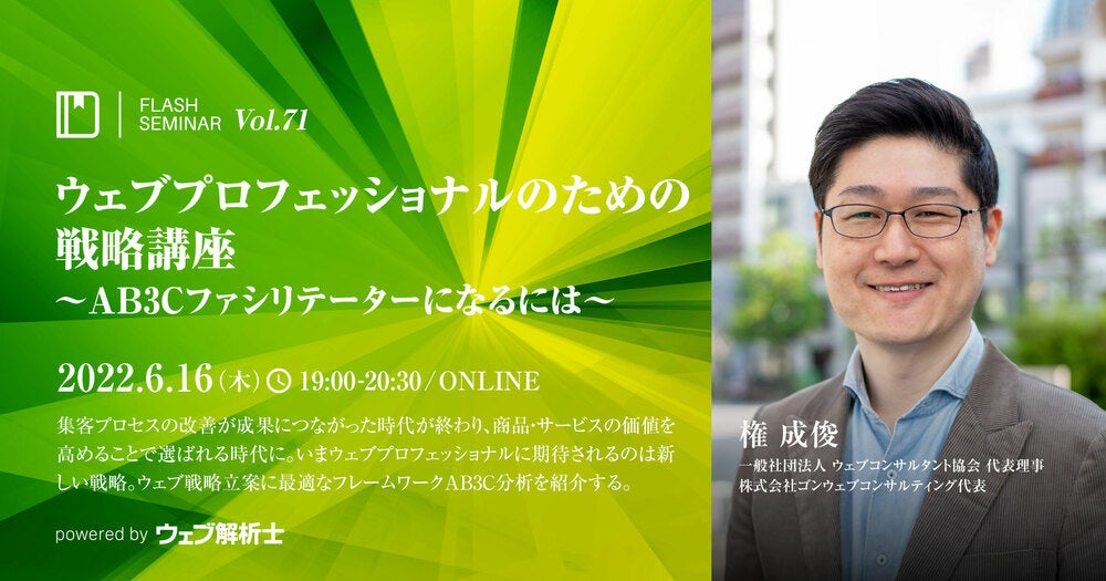 2022/6/16(木)19:00-20:30 FlashセミナーVol.71【無料】ウェブプロフェッショナルのための戦略講座 ~ AB3Cファシリテーターになるには ~