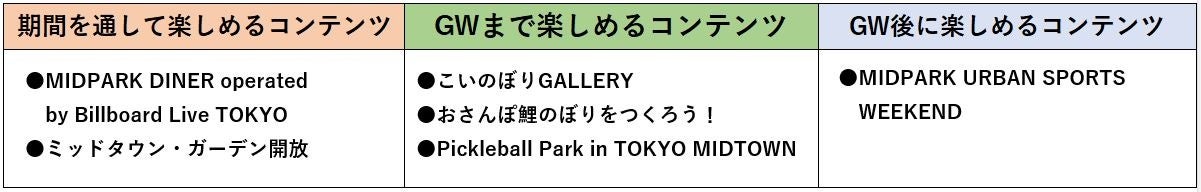 また5月6日(月・振休)までの期間は、この季節恒例の国内外のアーティスト・デザイナーによる約100匹のオリジナルこいのぼりが空を泳ぐ「こいのぼりGALLERY」をご覧いただけるほか、イベント後半には芝生広場やミッドタウン・ガーデンで都市型スポーツ体験が出来る「MIDPARK URBAN SPORTS WEEKEND」も開催します。都会の真ん中で自然を感じられる緑豊かな東京ミッドタウンで、ご家族やご友人と一緒にゆっくりとお過ごしください。