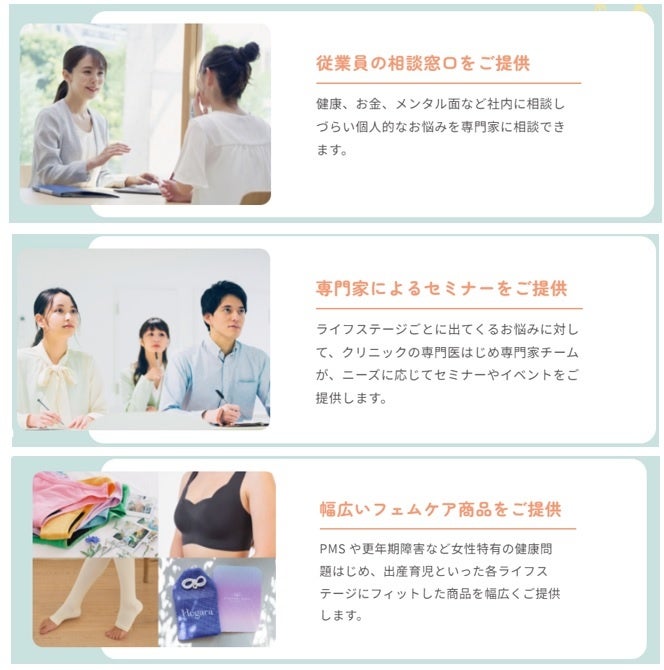通常の福利厚生ではカバーされにくい、PMSや更年期障害といった女性特有の健康問題のサポートからキャリア形成のサポート、専門家によるセミナーの提供、さらに吸水ショーツをはじめとした女性のほがらかな毎日をサポートするHogaraのアイテムを、従業員向けギフトとして特別価格でご利用いただくことができます。男性や社員の2親等までご利用いただけるので、働く女性だけでなく男性も含めた、一人ひとりのライフステージに寄り添い支援したい企業様向けのサービスとなっています。
