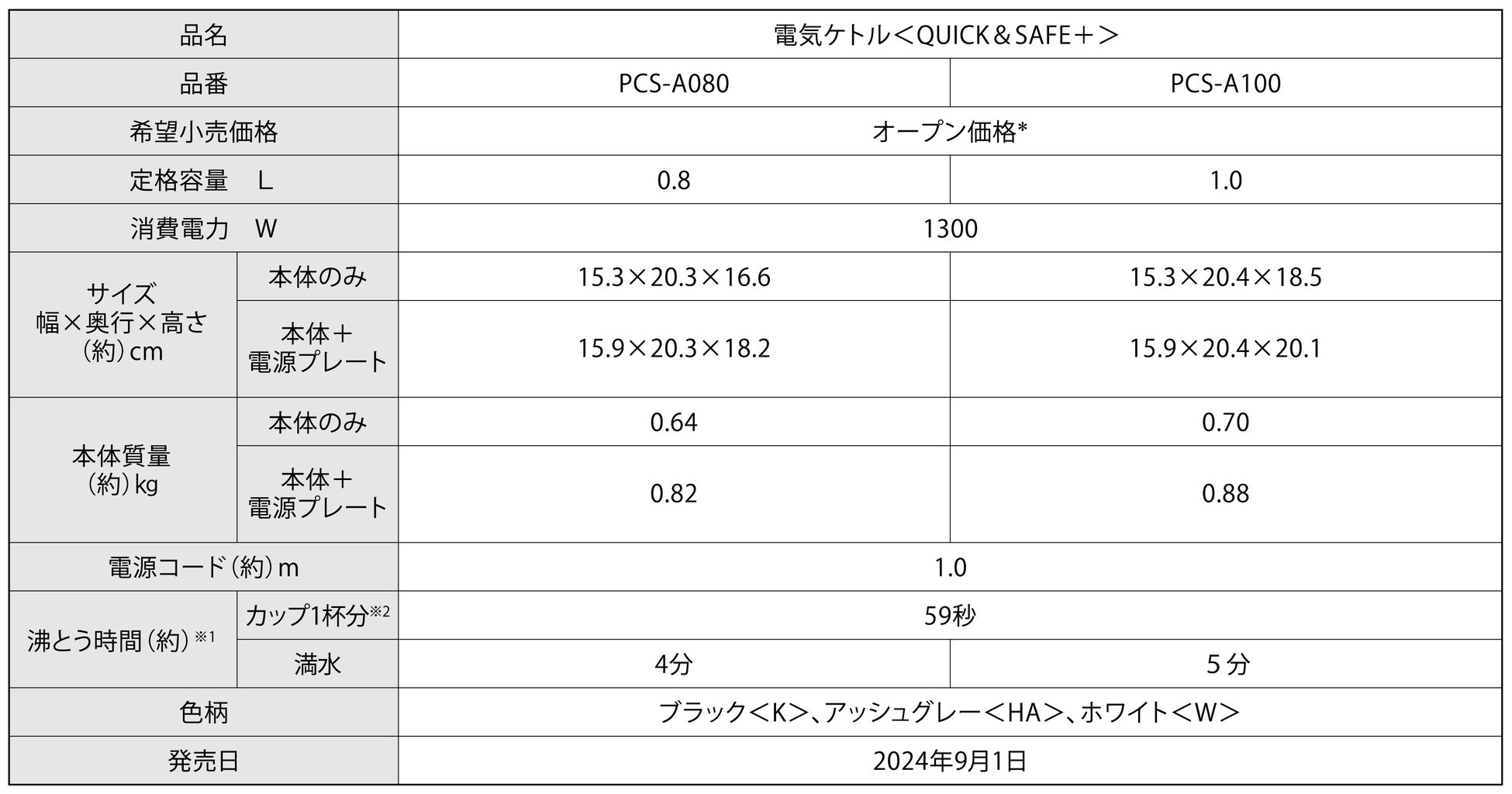 電気ケトル<QUICK&SAFE+> PCS-A080/A100 2024年9月1日発売