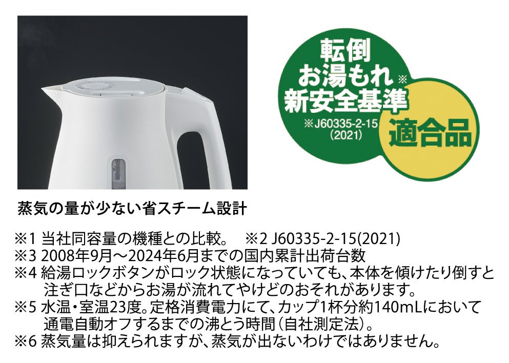 蒸気の量が少ない省スチーム設計。※6さらに、転倒お湯もれ新安全基準※2適合品で安心