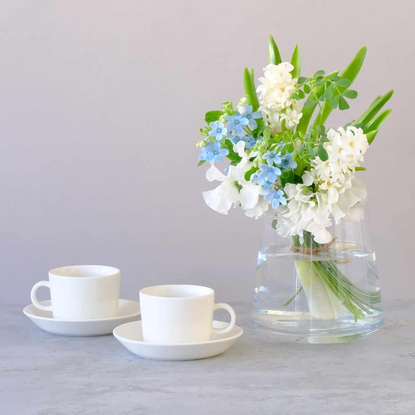 映画のキーアイテム、ゲッキツの可憐な白い花をイメージしたブーケ。春を告げる香りのよい白い花に沖縄の海や空を思わせるブルーの花を添えています。