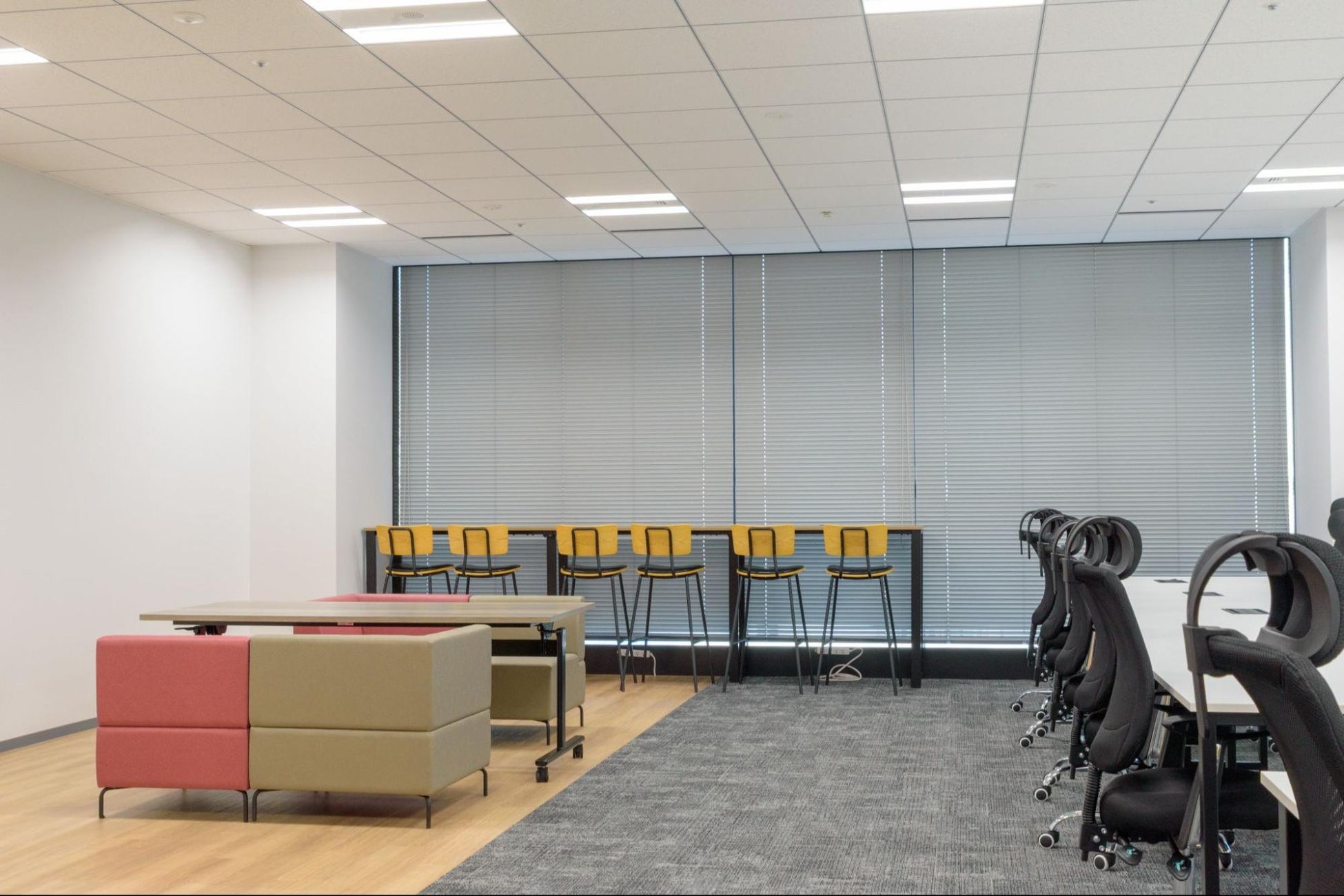 今回の鹿児島オフィスは、シンプルかつコンパクトでありながら、各社員がコミュニケーションの取りやすい空間に仕上げています。一方で、執務スペースはゆとりを持たせた配置で、チームごとのコラボレーションと個人の集中を両立しています。