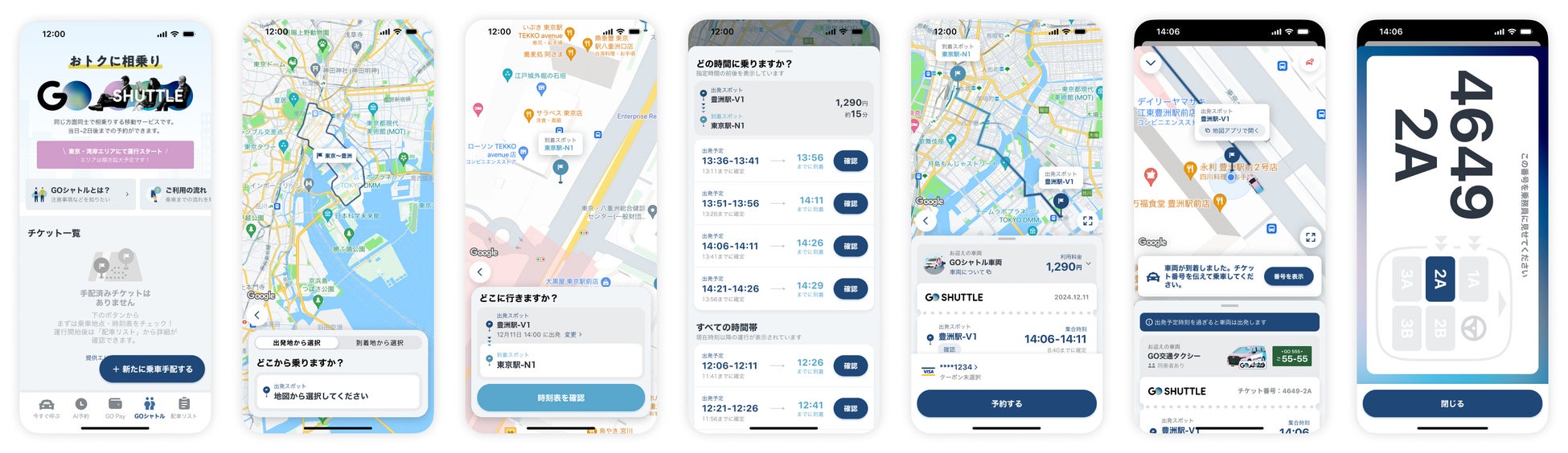 GO株式会社(本社:東京都港区、代表取締役社長:中島 宏)が展開するNo.1※1タクシーアプリ『GO』は、ユーザーの移動体験および供給力向上の新たな一手として相乗りサービス『GO SHUTTLE(ゴーシャトル)』を、2024年12月11日(水)より豊洲や勝どきなど湾岸エリアにて、都内ハイヤー・タクシー最大手である日本交通株式会社(本社:東京都千代田区、代表取締役社長:若林 泰治)の子会社、株式会社ハロートーキョー(本社:東京都江東区、代表取締役:望月 誠一)の運行協力を得て提供開始する予定です。