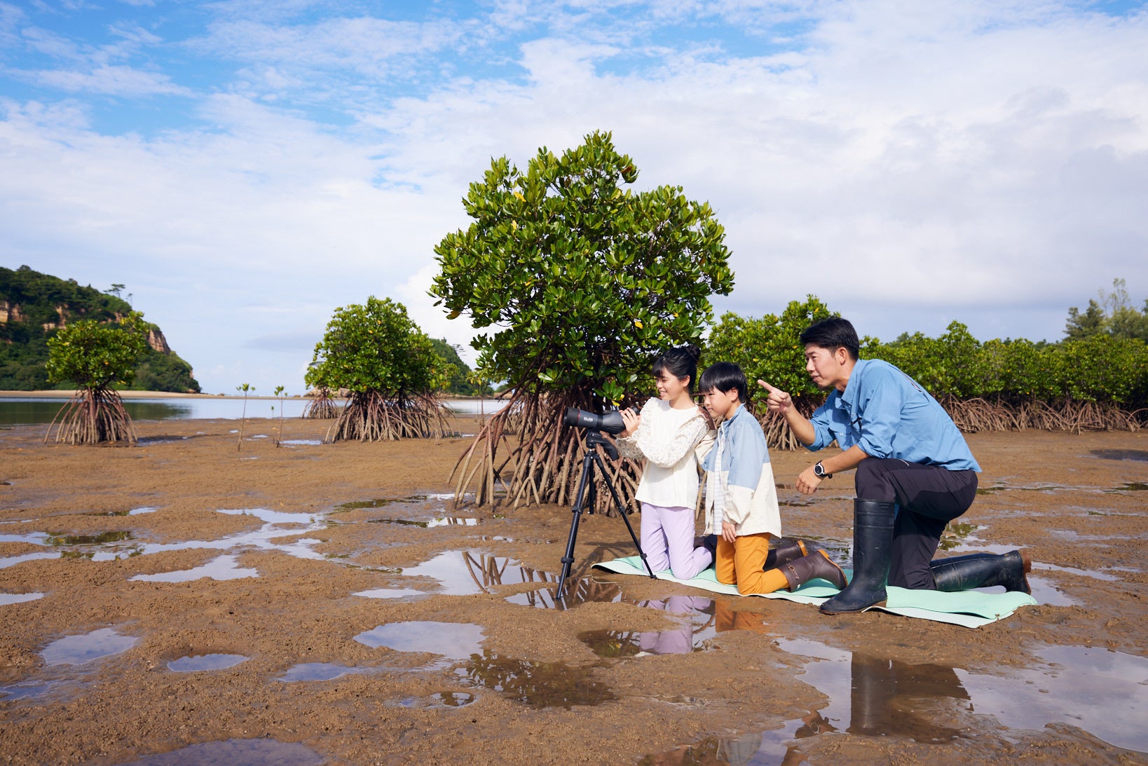 生き物について興味を持ったら、実際にフィールドに出て、気になるあの子を探しに行きます。それぞれの生き物の性格や習性、友だちへのアプローチ方法の心得について、ナチュラリストガイドがサポート。さらに今年は、フィールドスコープを使いながら干潟の生き物も観察するので、近づくとすぐに泥に潜ってしまう「照れ屋さん」なシオマネキやミナミコメツキガニなど、干潟の友だちとも仲良くなることができます。西表島に生息する生き物は同類の中でも種や遺伝子の多様性が高いため、よく見て交流することで共通点を見つけることができます。