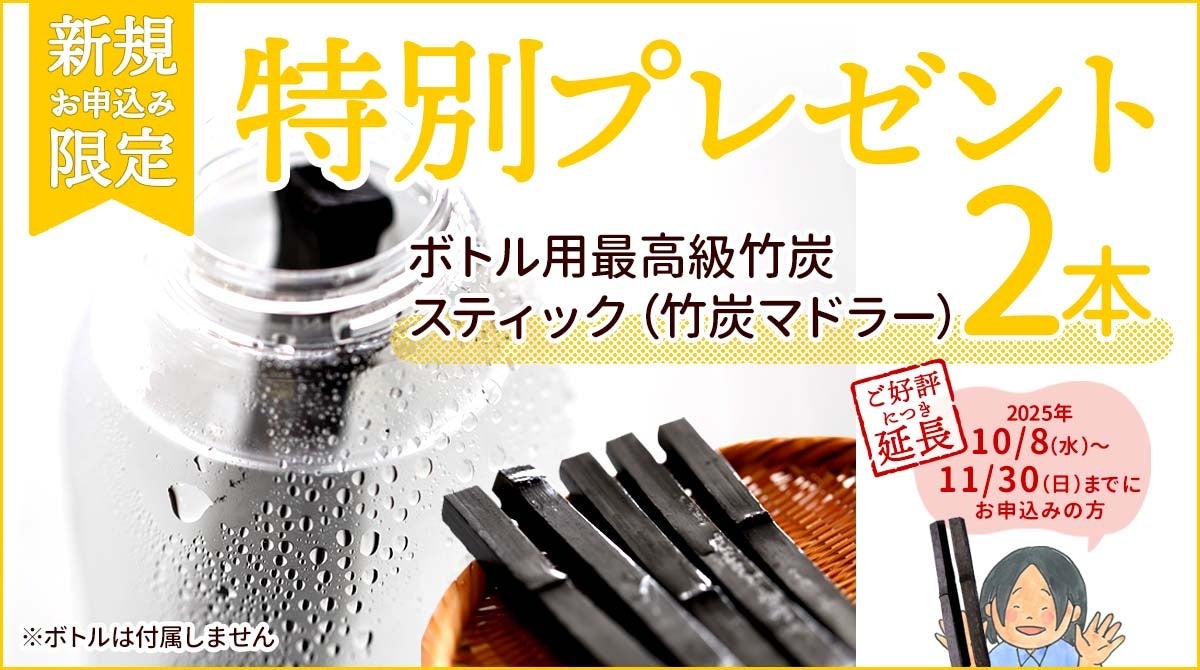 ご好評により延長決定!定期購入の新規申込者全員に最高級竹炭スティック(竹炭マドラー)2本をプレゼントするキャンペーンを、11月30日(日)まで実施中です。便利でお得な定期購入を始めてみませんか?