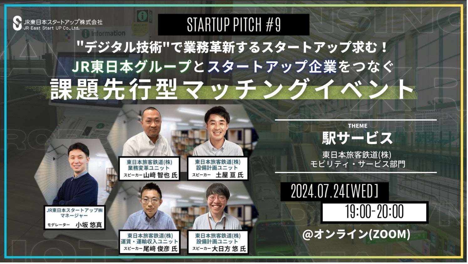 JR東日本スタートアップ株式会社(代表取締役社長:柴田 裕、以下「JR東日本スタートアップ」)は、東日本旅客鉄道株式会社(代表取締役社長:喜㔟 陽一、以下「JR東日本」)およびJR東日本グループからJR東日本グループの抱える課題を提示して、優れたアイデアや先端技術を持つスタートアップとのマッチングを推進するオンラインイベント「STARTUP PITCH」を開催することをお知らせします。