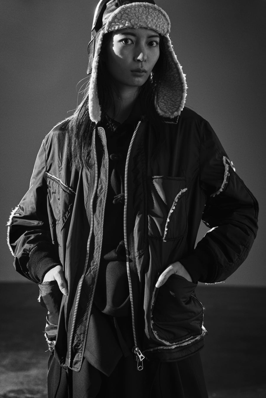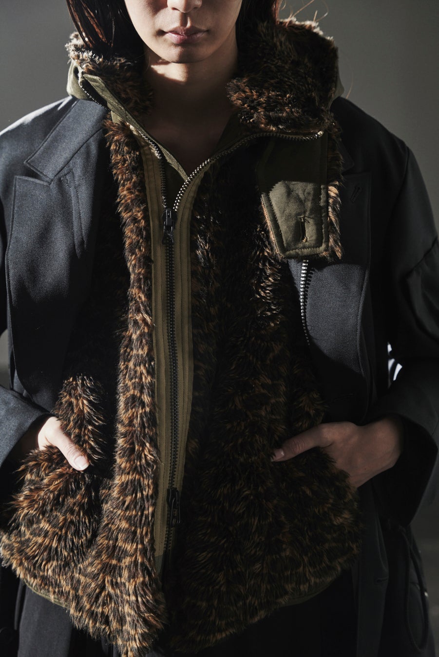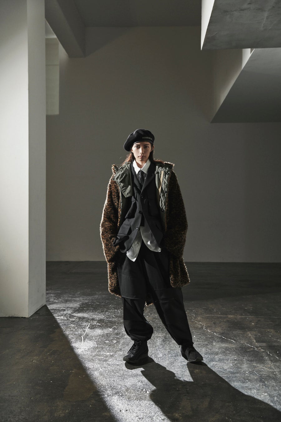 ミリタリーウェアのライナーから着想した、キルティング、ボア、ブラックやレオパードのフェイクファー素材のアイテム。フラップポケット、大き目のファスナー、ドローコード、2段リブなどのディテールの表現。表裏両面で着られるようにつくられたダブルフェイスのコートやブルゾン。ベレー帽やフライトハットのアクセント。