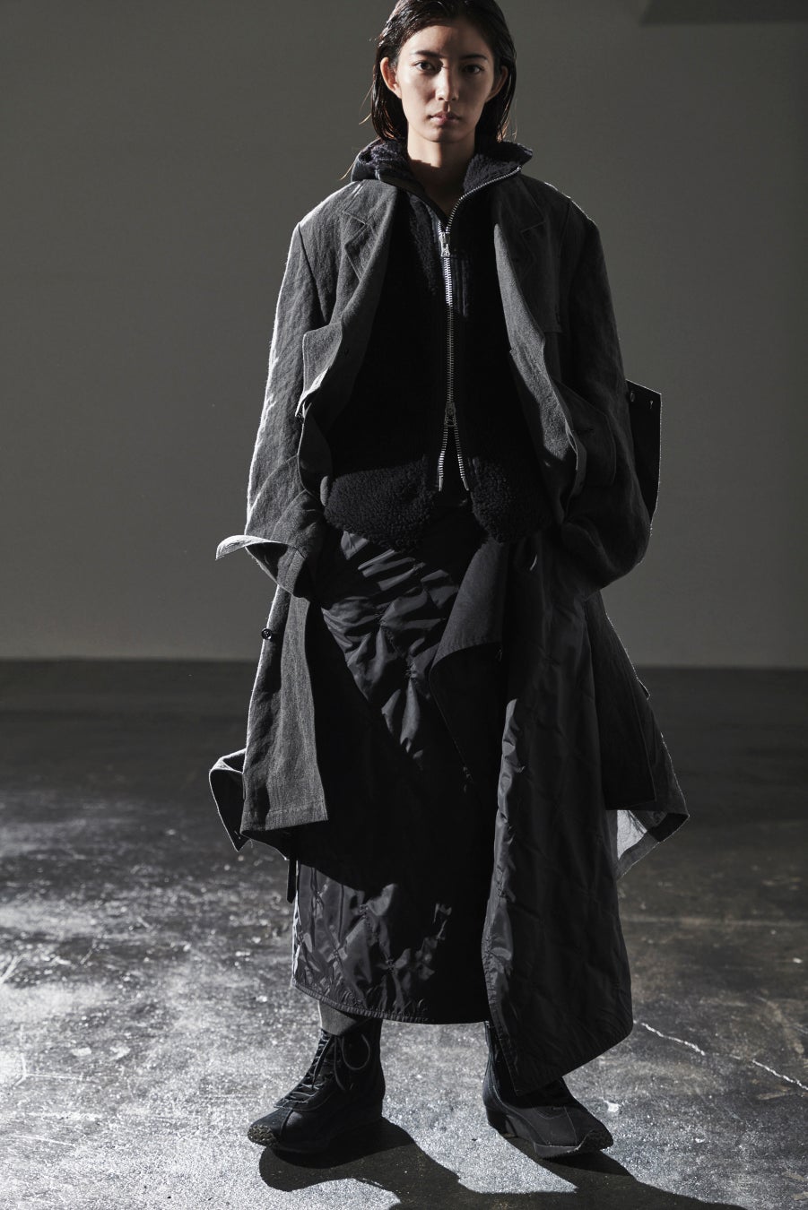 No.187 墨染めロングコート。両脇に配されたジップを開くとマチが拡がり、シルエットが変化する。不規則にあて布が構成され、それぞれが留めボタンの開閉で剥がれ落ちたような表情に。肘部分もジップを開くとマチが拡がり、動きやすさとデザイン性をつくるディテール。リネン100%の生地を不均一に染め上げ、自然なシワ感がユニークで特徴的な生地。