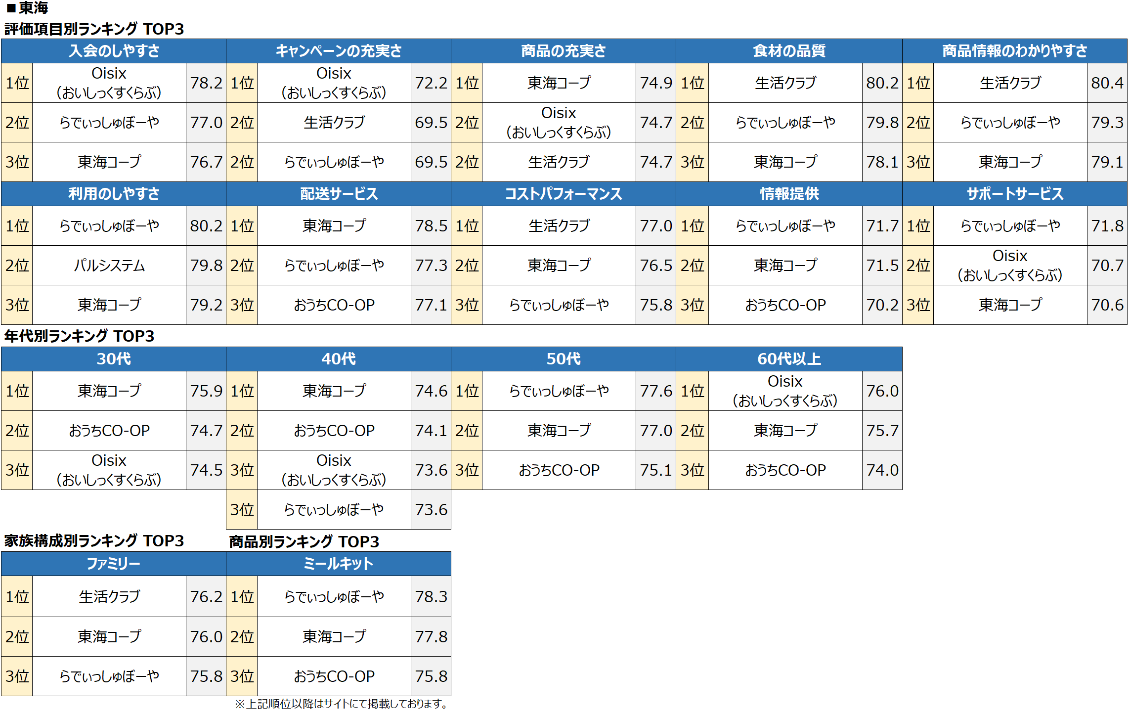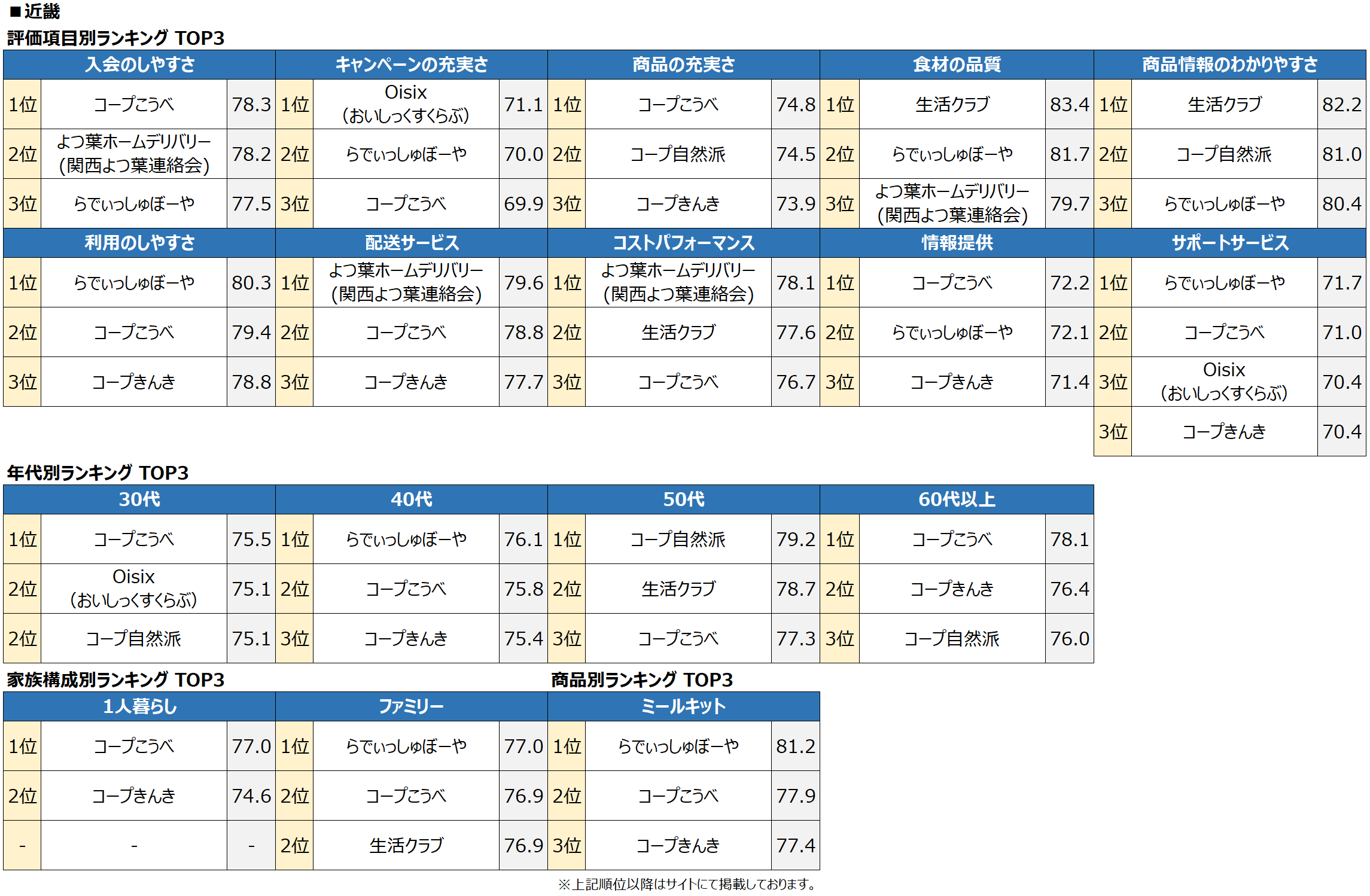 満足度の高い『食材宅配サービス』ランキング|【生活クラブ】が「首都圏」「東海」「近畿」で初の総合3冠 【コープこうべ】は「近畿」で初の総合1位に並ぶ