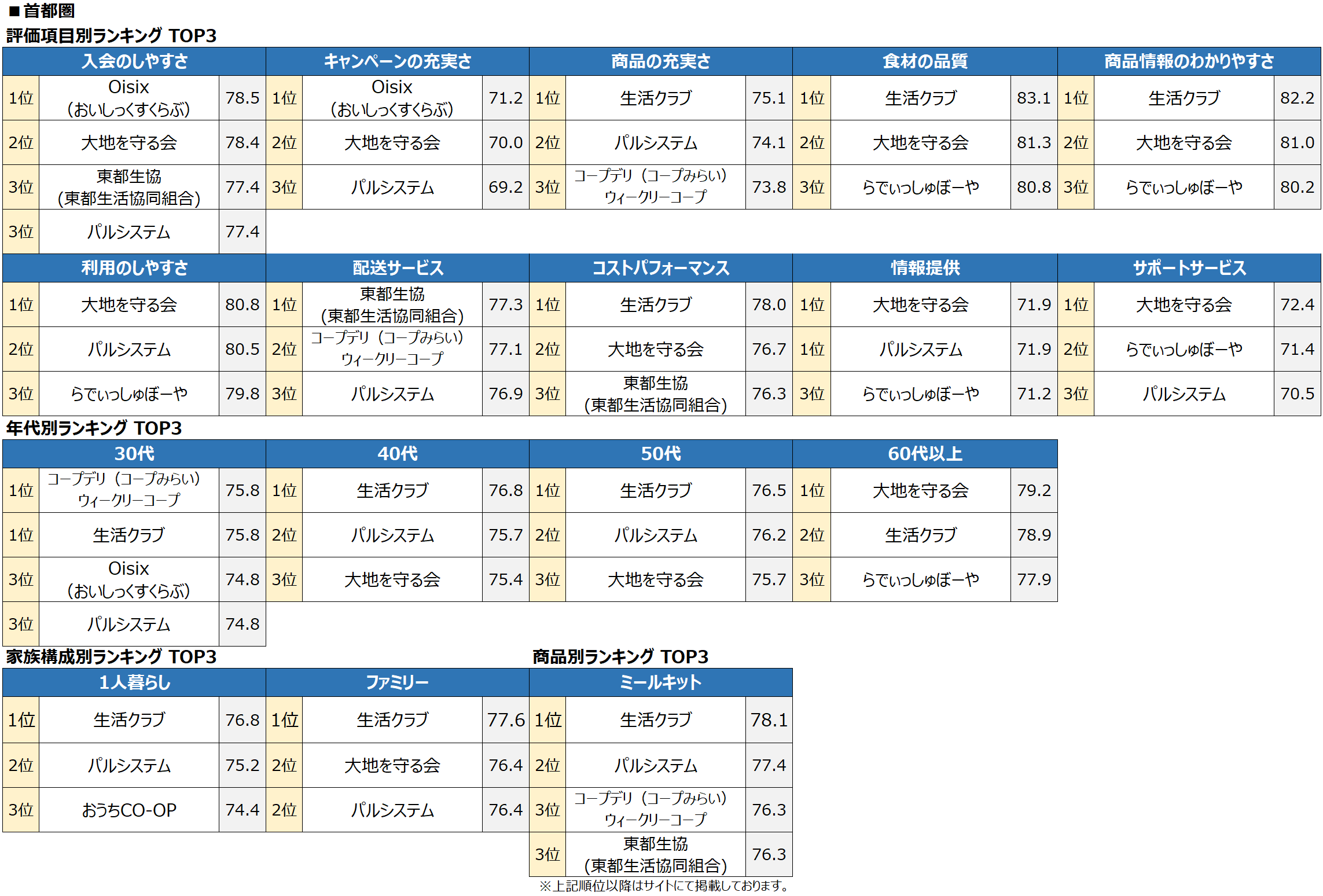 今回の調査では、【生活クラブ(生活クラブ事業連合生活協同組合連合会 本社:東京都新宿区)】が「首都圏」「東海」「近畿」の3ランキングすべてで総合1位となり、初の3冠を獲得しました。