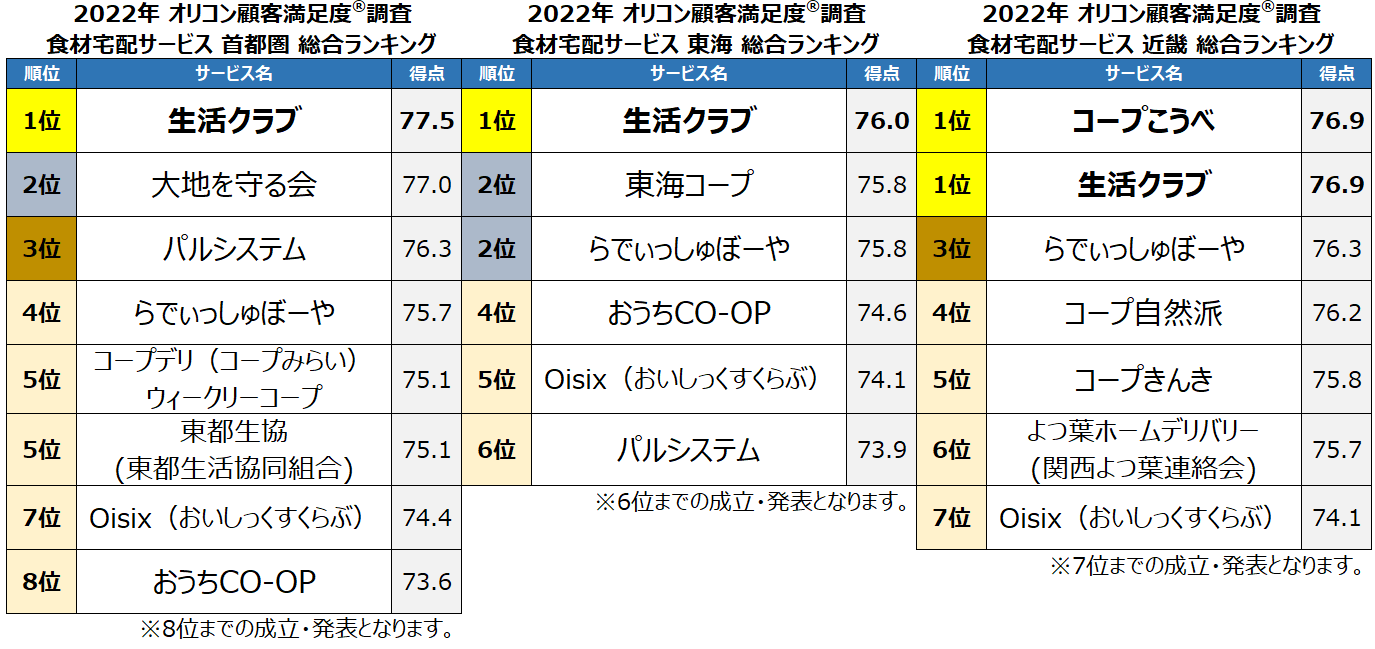 “見えない満足を可視化する”をコンセプトに、第三者の立場で顧客満足度調査を実施する株式会社oricon ME(読み:オリコン エムイー 本社:東京都港区 代表取締役社長:小池恒)は、『食材宅配サービス(首都圏/東海/近畿)』についての満足度調査を実施し、2022年2月1日(火)14時00分にその結果を「オリコン顧客満足度®」公式サイト内( https://life.oricon.co.jp/ )にて発表いたしました。結果は【生活クラブ】が初の3地域すべてで、【コープこうべ】は初の「近畿」で総合1位を獲得しました。