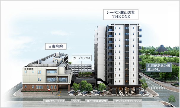 本プロジェクトは、医療施設を更新しつつ、まちなか居住の促進を行う事業であり、地域生活拠点型再開発事業※1として、市街地環境の整備改善を図ることを目的として創造されます。敷地周囲には空地や緑地を設け、ベンチ等も整備することで21世紀記念公園との連続性を考慮した憩いの場も整備されます。住まいの提供を通して土地の価値を向上させ、地域社会のインフラ整備に寄与するプロジェクトです。