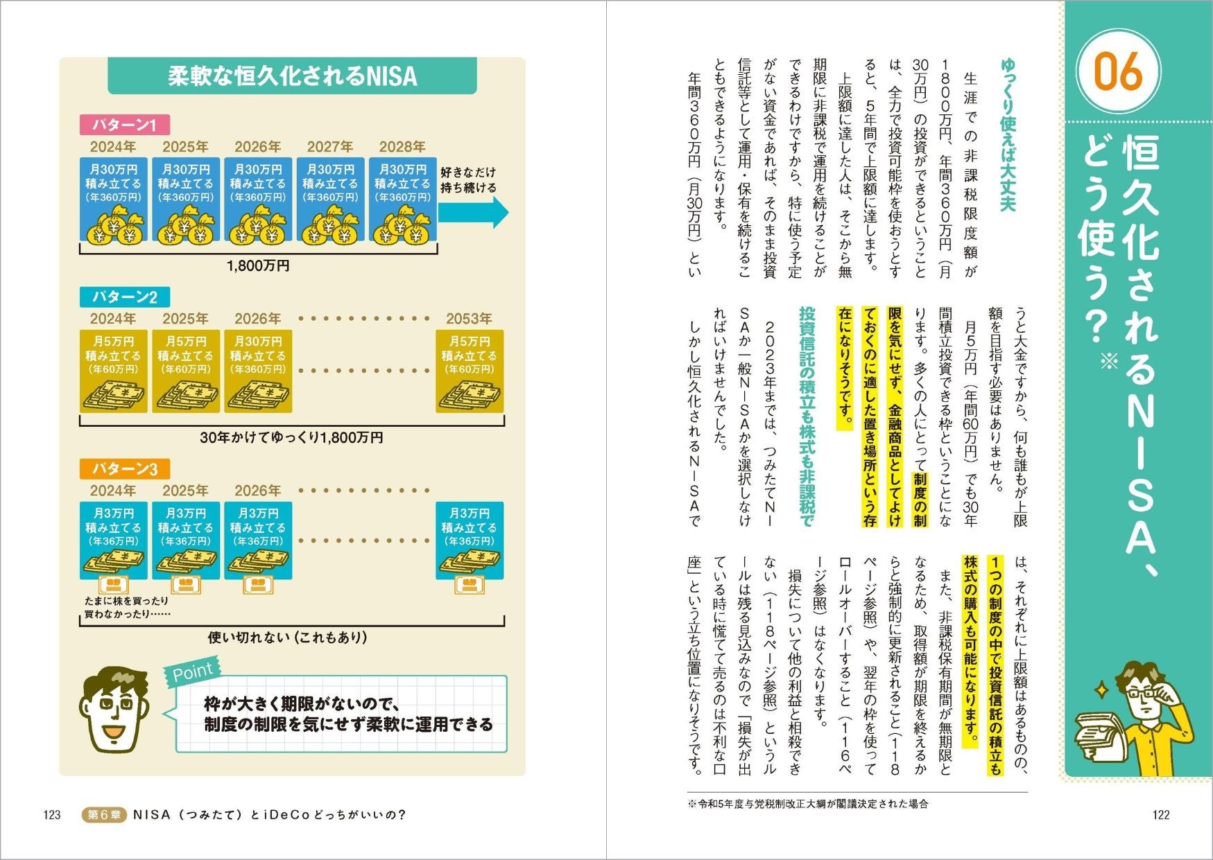 2024年から施行されるNISA制度の恒久化(令和5年度税制改正大綱を反映)についても解説し、それを見据えた投資方法も伝授。「NISAとiDeCo、どっちを優先したらいいの?」という疑問や、NISA(つみたて)、iDeCoの活用法もしっかり解説します。さらに、定番の投資先である株式、債券、外貨の仕組みや金投資、不動産投資、保険などについてもカバーし、コラムでは投資初心者がFX、仮想通貨、最近登場したNFTなどとどのように付き合うべきかについても触れています。