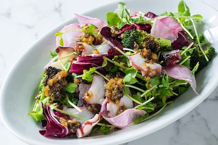 オリーブオイルでグリルしたタコ、ローストしたブロッコリーを、豆苗、トレビス、スライスした紅芯大根と一緒に塩昆布ドレッシングで仕上げた香ばしいサラダです。ドレッシングは、わさびと酢の効いた和風味。