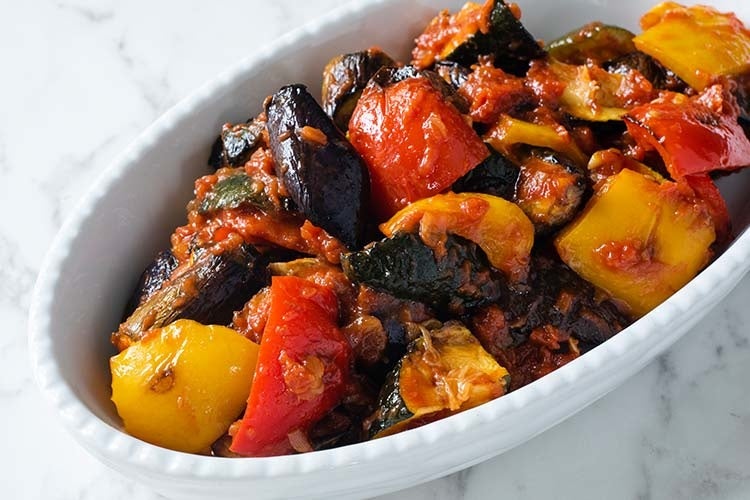 ローストして味わいをギュッと凝縮したナス、ズッキーニ、パプリカに、濃厚なトマトソースを絡めました。濃いめのトマトソースに負けないよう、野菜は大きめにカット。野菜それぞれのおいしさが感じられるラタトゥイユです。