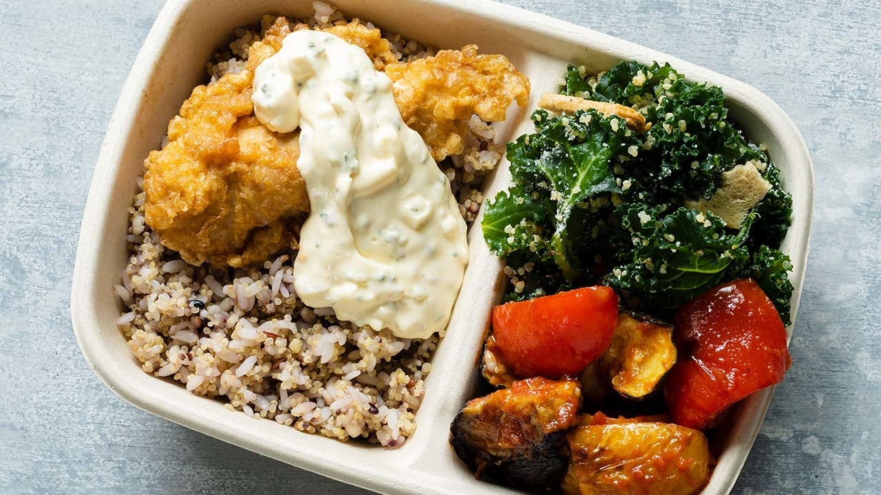 食べ応えのあるメインディッシュに、サイドディッシュ、彩り豊かな野菜サラダが一品ずつ選べる「お弁当」です。テイクアウトはもちろん、広尾店ではイートインも可能。プチプチとした食感で食べ応えもある雑穀ごはんと一緒にお召し上がりください。