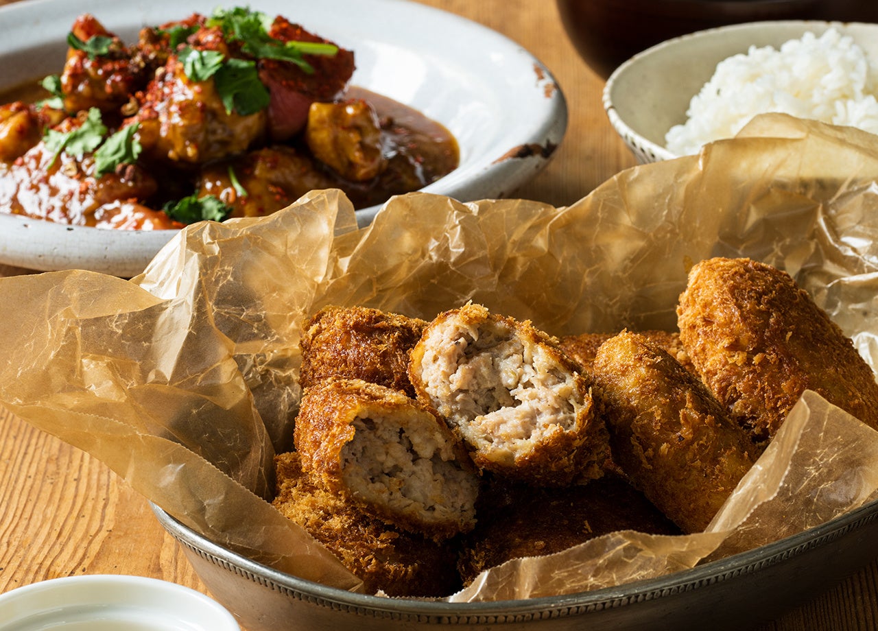 ジューシーなもち豚のひき肉を使用したメンチカツ。ジェノベーゼソースと、塩と砂糖でローストしたレモンのソースを添えました。2種のソースは混ぜてお召し上がりください。香り高く、酸味とのバランスも取れた味わいをおたのしみいただけます。