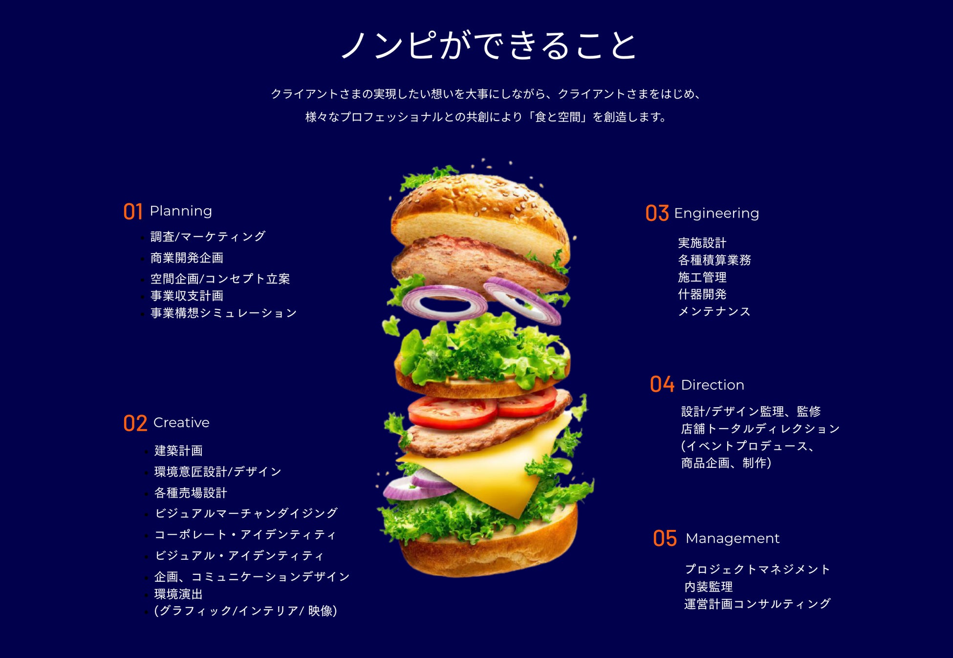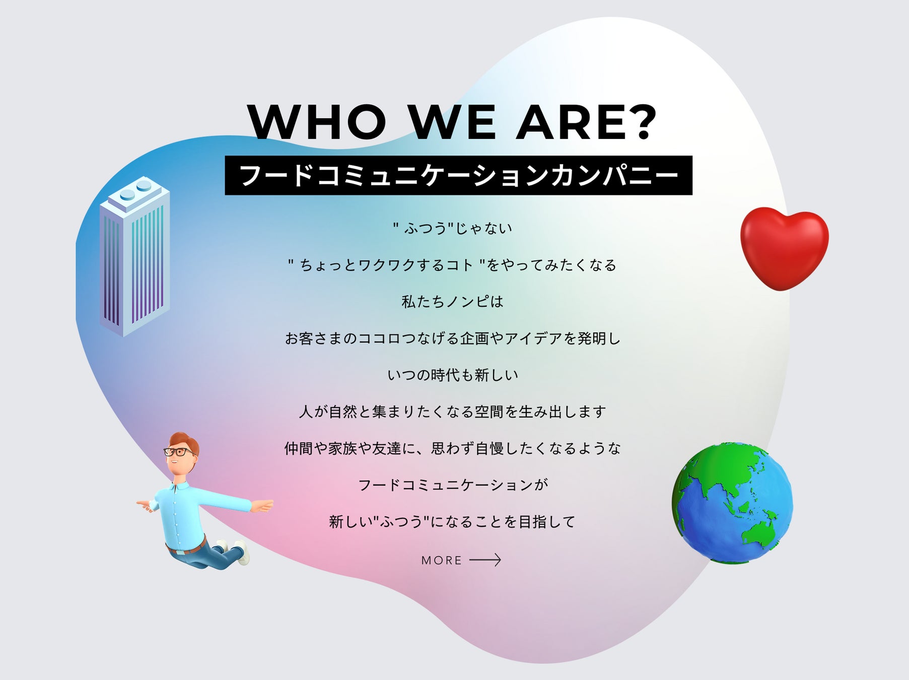 ノンピは、「ふつう」じゃない「ちょっとワクワクすること」をやってみたくなる人たちの集まりです。フードコミュニケーションカンパニーとして、フードコントラクト業界の「新しい」を作りたい。という意気込みを掲げるべく、クライアント様、株主様、現在の仲間、そして未来の仲間に向けて、デザインを施しました。ぜひ、一緒にコミュニケーションが生まれる「wow!」を作らせてください。