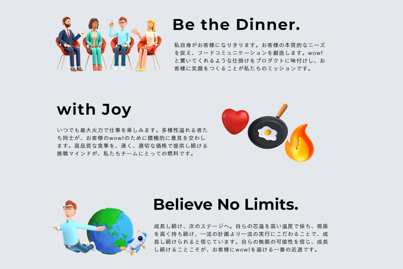 ノンピレシピ(バリュー)である3つの心がまえ「Be the Dinner.」「with Joy.」「Believe No Limits.」を持ち、食と空間のコンサルから運営まで、クライアントの想いに寄り添って共創します。