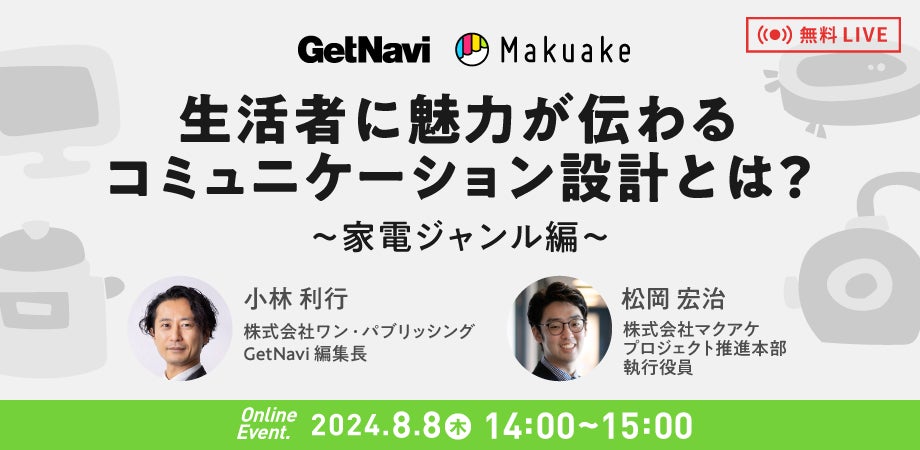 今回の特別プラン提供開始を記念して、家電業界の事業者向けの共催セミナー「【GetNavi×Makuake】生活者に魅力が伝わるコミュニケーション設計とは?〜家電ジャンル編〜」を2024年8月8日(木)に開催します。本セミナーでは、「GetNavi」編集長を務める小林利行氏と、当社プロジェクト推進本部 執行役員の松岡宏治が、本特別プランや家電領域のトレンドや消費者ニーズの変化、ユーザーに伝わる表現のポイントについて解説する予定です。