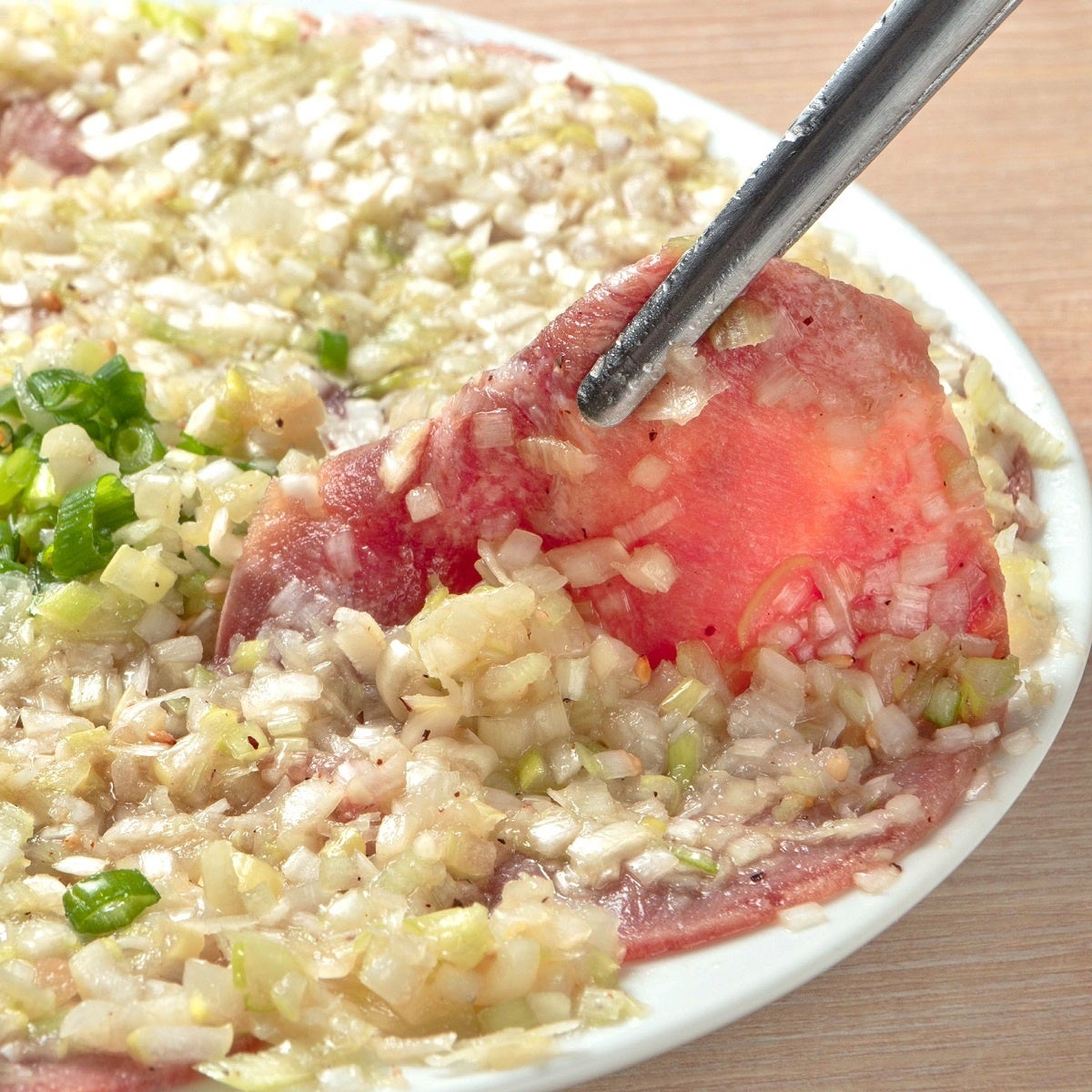薄切り牛タンに大人気旨塩にんにくタレをたっぷり擦り込み、寿司下駄にドーーンと盛り付けた、ときわ亭の新名物です。