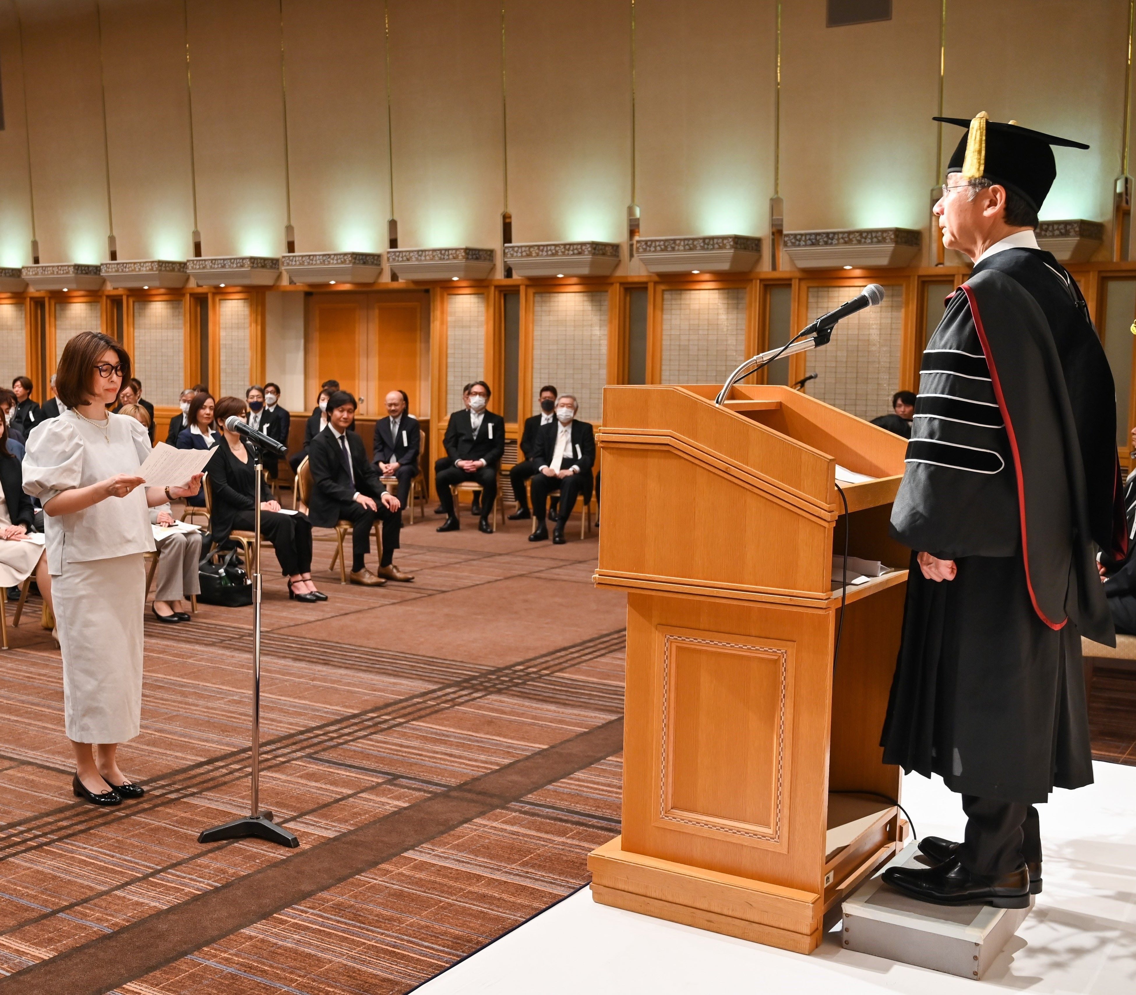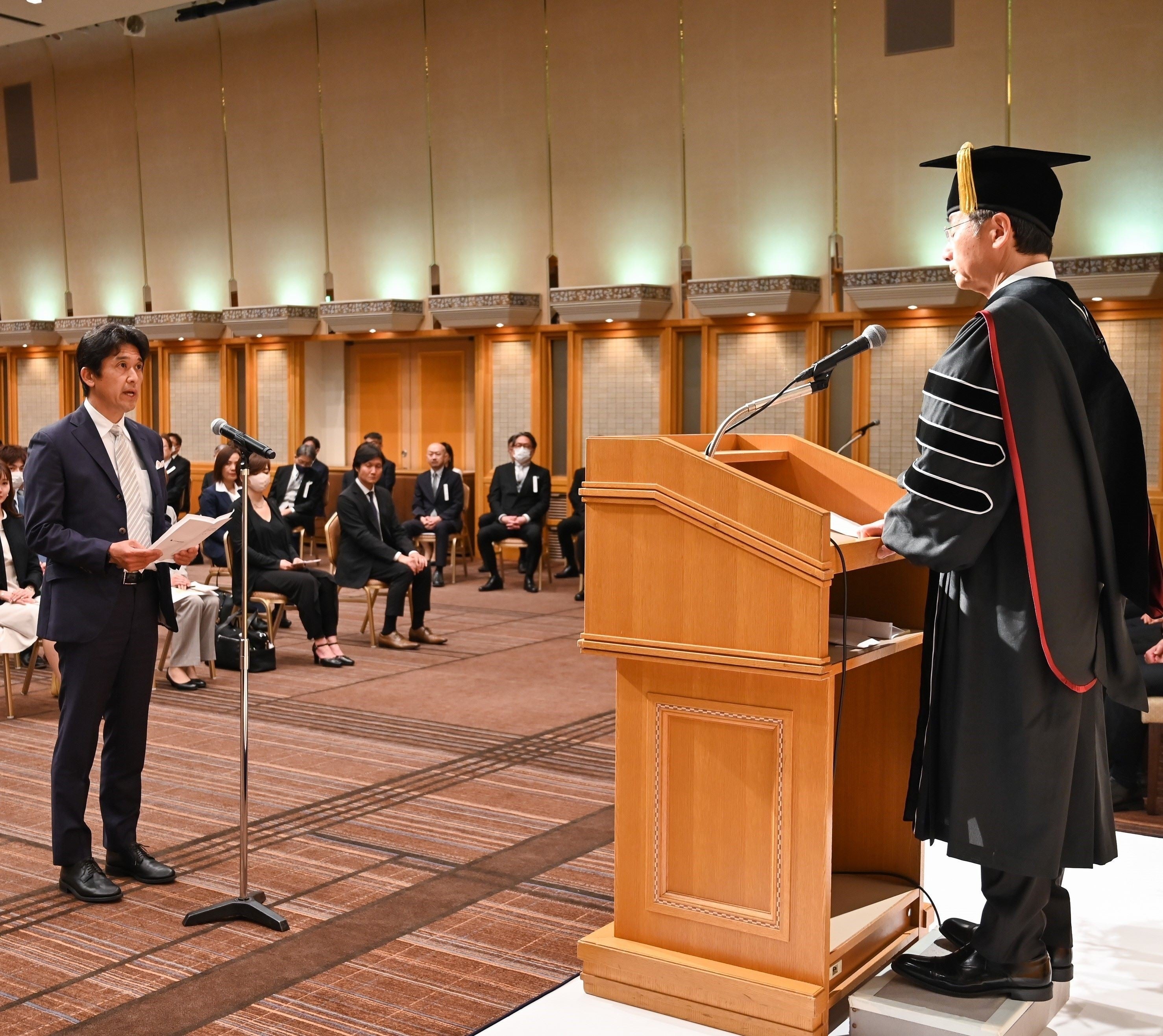 本式では、学長 吉國浩二より御祝いの言葉が贈られたほか、列席者の紹介、およびコミュニケーションデザイン研究科、実務教育研究科それぞれ代表院生より入学院生宣誓が行われました。