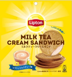 「リプトン ミルクティークリームサンド」はリプトンの紅茶エキスパウダーを使用したミルクティークリームを、サクサクの薄焼きの生地でサンドした商品です。軽い食感とまろやかなミルクティークリームの味わいが絶妙にマッチしています。