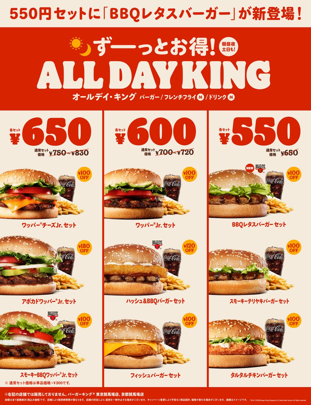 2024年7月26日(金)より、バーガーキング® の対象のバーガーとフレンチフライ(M)、ドリンク(M)を、平日も休日も朝昼夜、いつでもお得な価格で楽しめるセット「オールデイ・キング」のラインアップがリニューアルいたします。