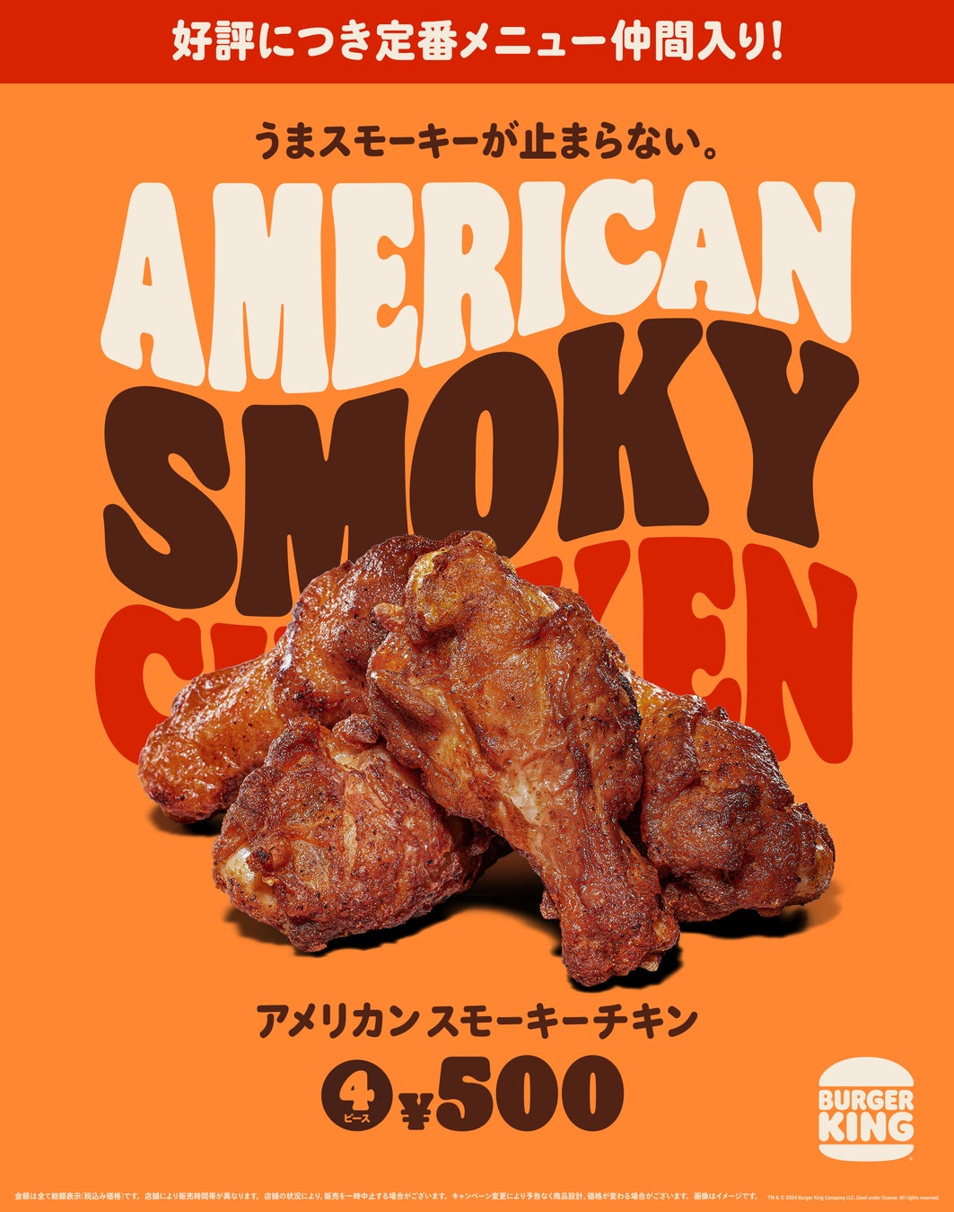 2024年7月26日(金)より、人気のサイドメニュー『アメリカン スモーキーチキン』が定番メニューに仲間入りいたします。