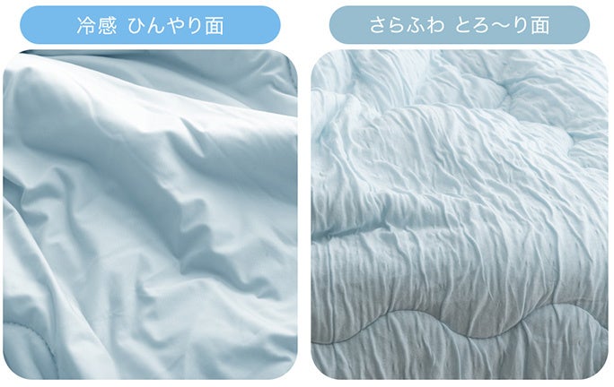 前述の通り、除湿力に優れた独自開発の「エアコンドライ綿」を使用することにより布団の中に湿気がこもりにくく、さらに、表面にレーヨン生地、裏面に接触冷感生地と2種類の生地を使用することにより、真夏の暑い季節から春・秋などの涼しい季節まで長期間快適に使用可能になっています。