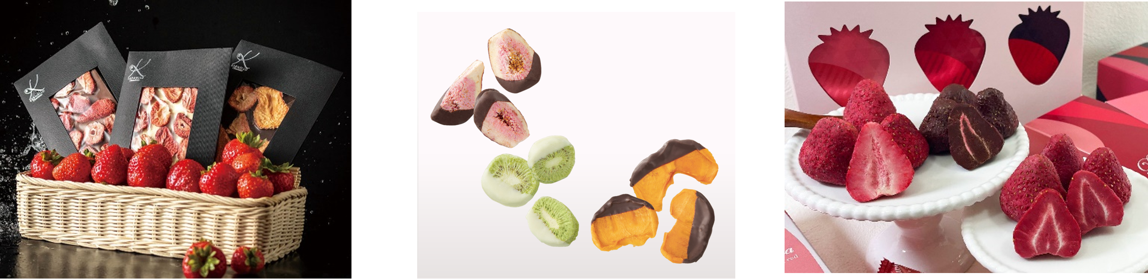 フリーズドライの苺に、各種チョコレートを染み込ませたフィージョンスイーツ。