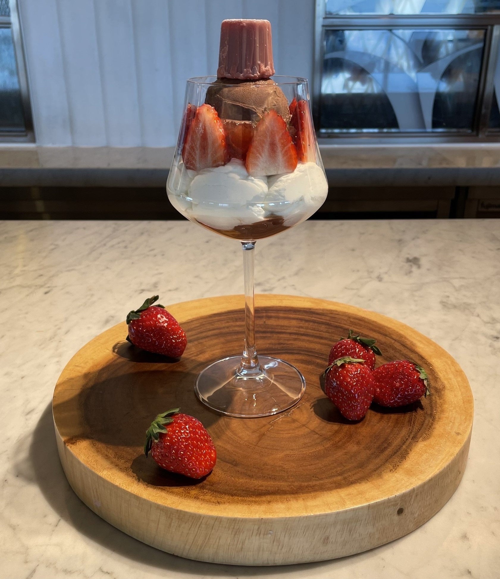 チョコレートクリームをたっぷり使用した大福の上に、瑞々しい厳選いちごをのせました。