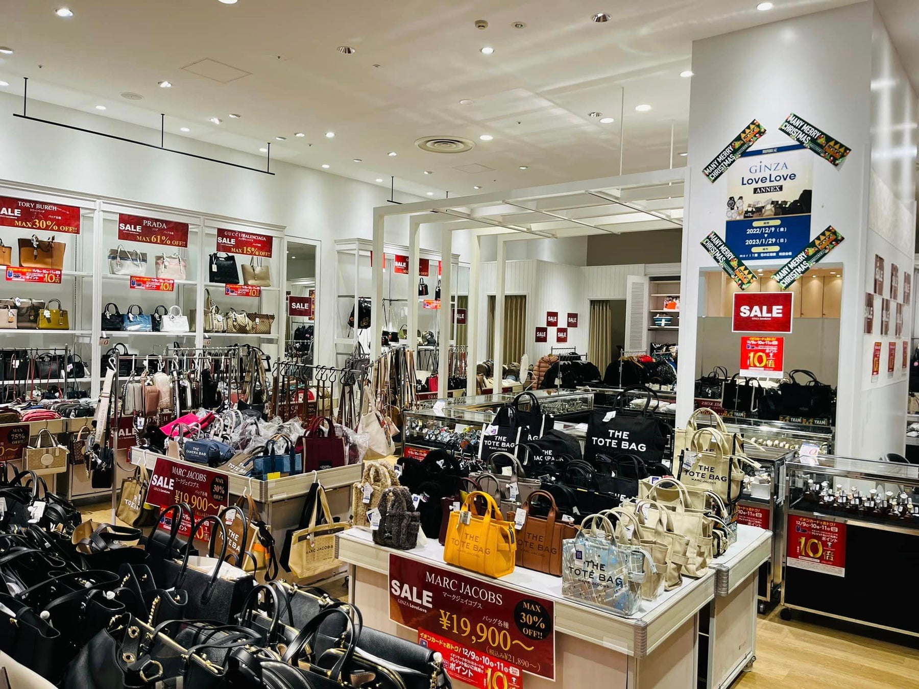 この度の催事店舗では、PRADA、GUCCI、BURBERRY、Stella McCartney等のラグジュアリーブランドバッグをお買い得価格で販売いたします。また、GINZALoveLove常設店で取り扱いのないアパレルコーナーも展開し、MONCLER、TATRAS、THE NORTH FACEのブランドアウター、PREMIATA、FENDIなどのブランドシューズをお買い得価格で販売いたします。