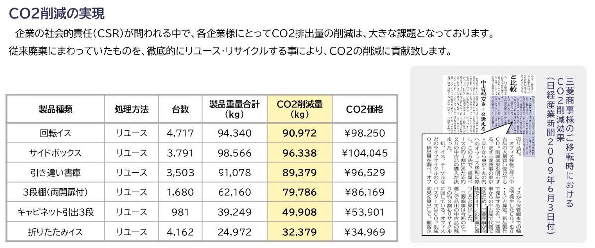 当社では、できる限り多くのオフィス家具を、廃棄せずに買い取って再生することにより、コスト面のメリットだけでなく、二酸化炭素の排出削減にもつながります。SDGsの12番「つくる責任 つかう責任」や13番「気候変動に具体的な対策を」で提言されているような環境問題の解決に企業として貢献できます。リユース買取について、CO2削減量を合計計算して報告する事も可能です。
