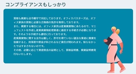 オフィスバスターズは環境コンサルティングサービスとして、全国の収集・運搬業者および処分業者の紹介、事務手続き代行等、コンプライアンスをサポートしますので、お客様の負担を軽減し、適正な廃棄物処理を行うことができます。