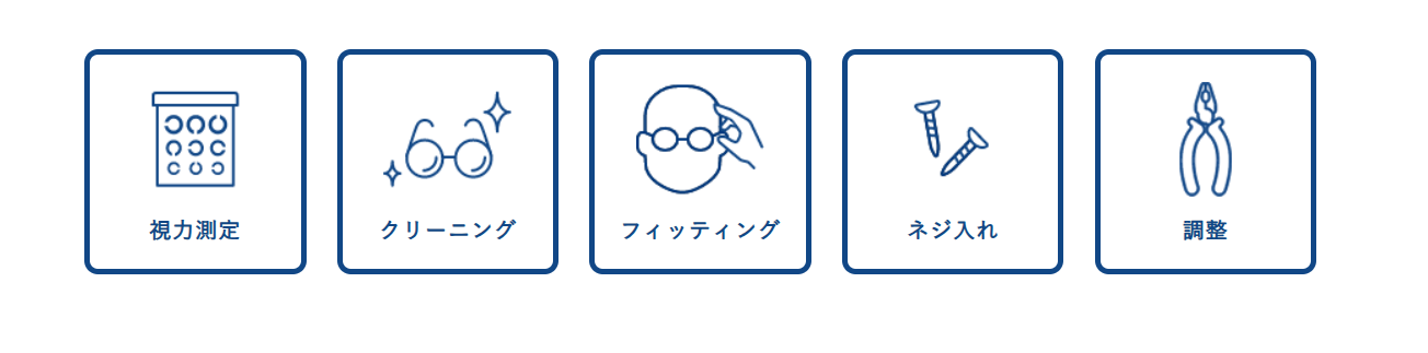 ご愛用のメガネのメンテナンスもAIGANにお任せください。視力測定・クリーニング・フィッティング・ネジ入れ・調整の「5つの無料サービス」を行っております。