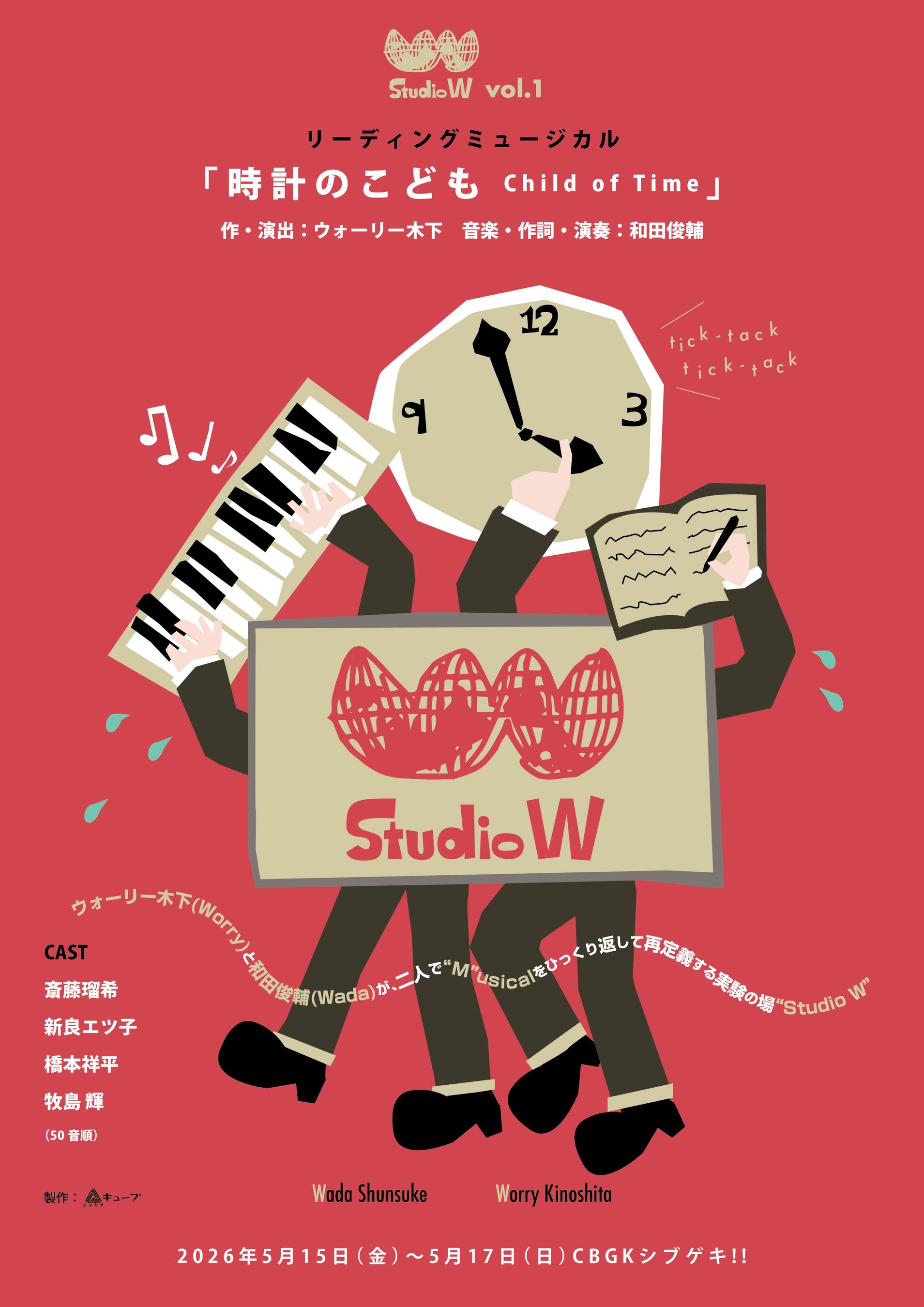 演出家・劇作家のウォーリー木下と、音楽家の和田俊輔が結成した創作ユニット「Studio W(スタジオダブル)」の第一弾公演として、2026年5月15日(金)から17日(日)までCBGKシブゲキ!!にて上演される、Studio W vol.1 リーディングミュージカル『時計のこども Child of Time』。