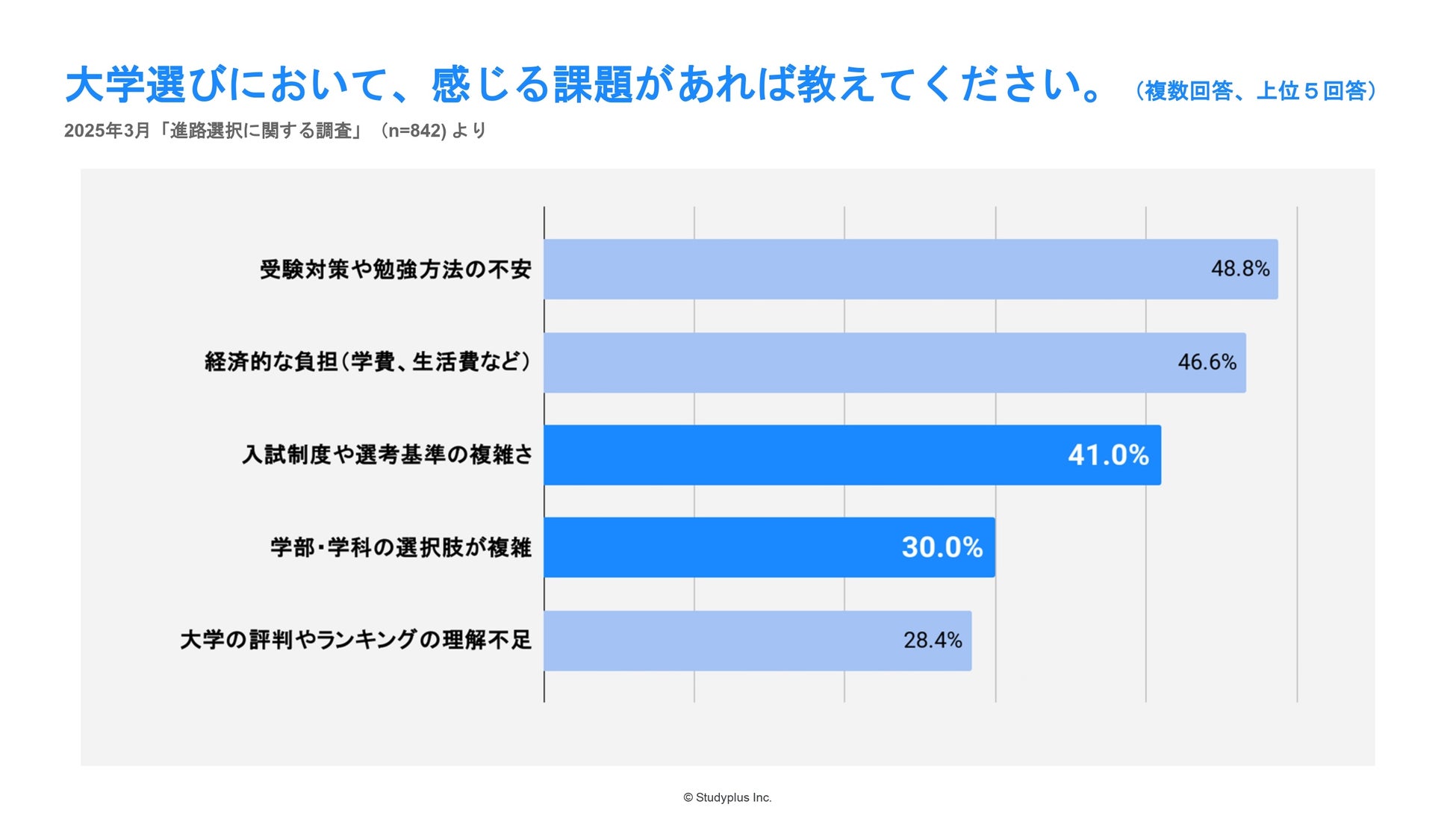 86.5%が大学受験時の進路選びで迷ったことがあったと回答しており、大学選びにおける課題として「受験対策や勉強方法の不安」(48.8%)「経済的な負担(学費、生活費など)」(46.6%)に次いで「入試制度や選考基準の複雑さ」(41.0%)「学部・学科の選択肢が複雑」(30.0%)を認識していることがわかりました。