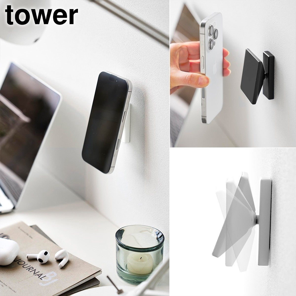 ホルダー部分にネオジムマグネットが内蔵されているので、マグネットがつくスマートフォンやMagSafe対応ケースなどを、壁面に貼り付けられるスマホホルダーです。