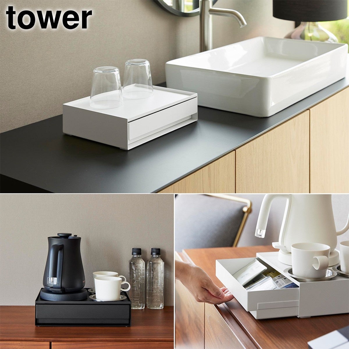 洗面まわりのアメニティグッズやドリンクまわりの小物をすっきり隠して収納できる、スチール製の引き出し式ケースです。