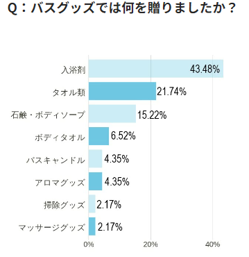 バスグッズを贈ったかたにその内容を伺ったところ、入浴剤が4割以上でトップに。続いてタオル類、石鹸・ボディソープと続きました。
