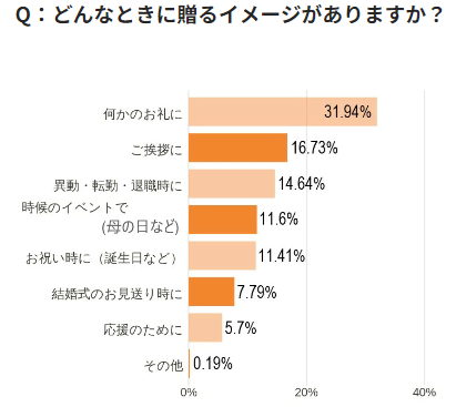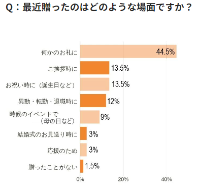 実際に一番最近贈ったシーンとしては、やはり「何かのお礼」が突出して多く、続いてご挨拶・お祝い・部署異動と続きました。