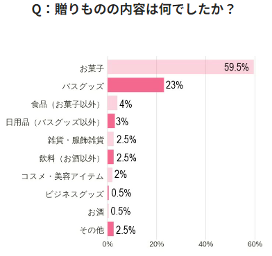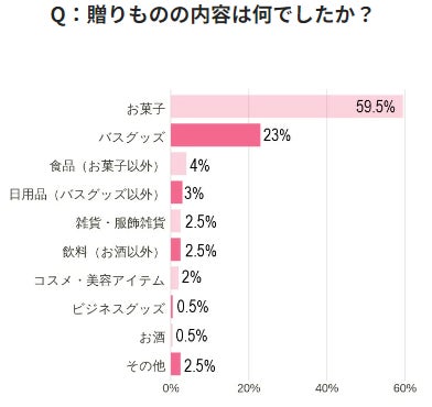 贈り物の内容としては「お菓子」が約6割とダントツで、2位にバスグッズが続きました。トップではないものの、バスグッズも3位以降のお菓子以外の食品や日用品と大きく差をつけており、プチギフトとしての人気度が高いことがわかります。