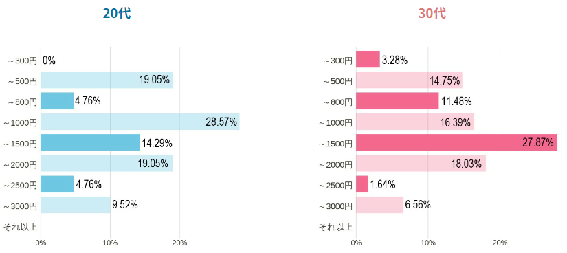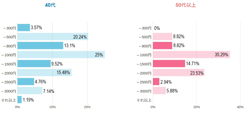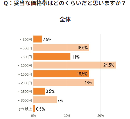妥当な金額としては、~1000円と回答されたかたが多く、年代ごとにもう少し高めなど若干の違いがあるものの、3000円よりも高い金額を答えるかたは殆ど見られませんでした。