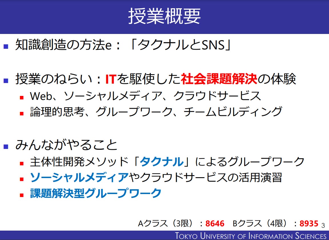 東京情報大学総合情報学部1年生対象の選択必修科目『知識創造の方法』では、「何が必要かを自分で考えて行動する主体性を身につけること」を到達目標として、グループワーク主体の授業を行っています。